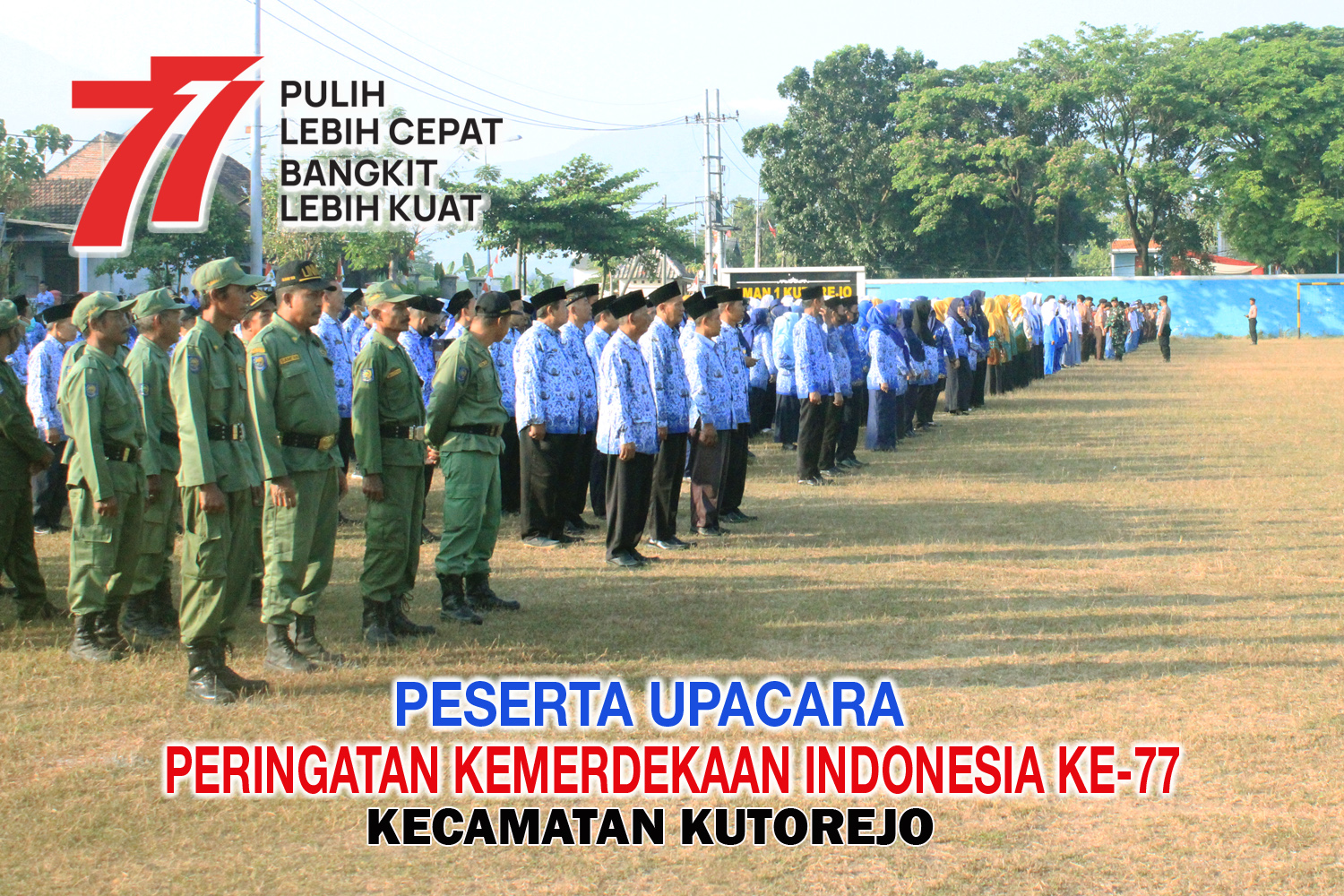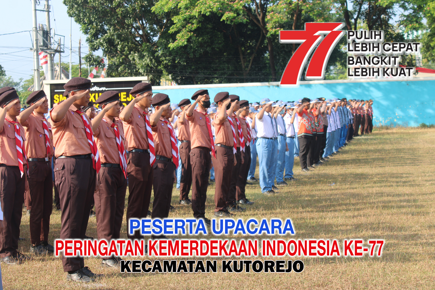 Kata penyemangat dalam peringatan kemerdekaan Republik Indonesia yang banyak dilontarkan seluruh rakyat Indonesia pada setiap peringatan Kemerdekaan Republik Indonesia. Pada peringatan Kemerdekaan Republik Indonesia tahun ini terasa begitu “Meriah” setelah sempat perayaannya hanya sebatas dimedia sosial (elektronik dan cetak). Setelah pandemi Covid-19 melanda negeri ini masyarakat sempat kehilangan semangat, namun pada peringatan Kemerdekaan Republik Indonesia tahun ini masyarakat Indonesia meluapkan kerinduan akan Perayaan kemerdekaan. Alhamdulillah pada Upacara peringatan Kemerdekaan Republik Indonesia yang ke-77 tahun 2022 ini dilaksanakan dengan penuh hidmat dan sakral. Semua peserta Upacara mengikuti rangkaian kegiatan Upacara dengan penuh suka cita dan semangat dengan jargon “Pulih Lebih Cepat, Bangkit Lebih Kuat” menambah kehidmatan Upacara Peringatan Kemerdekaan Republik Indonesia.